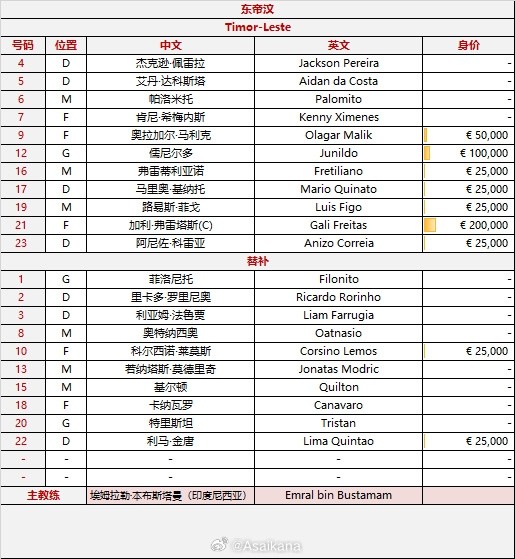 东帝汶U23首发: