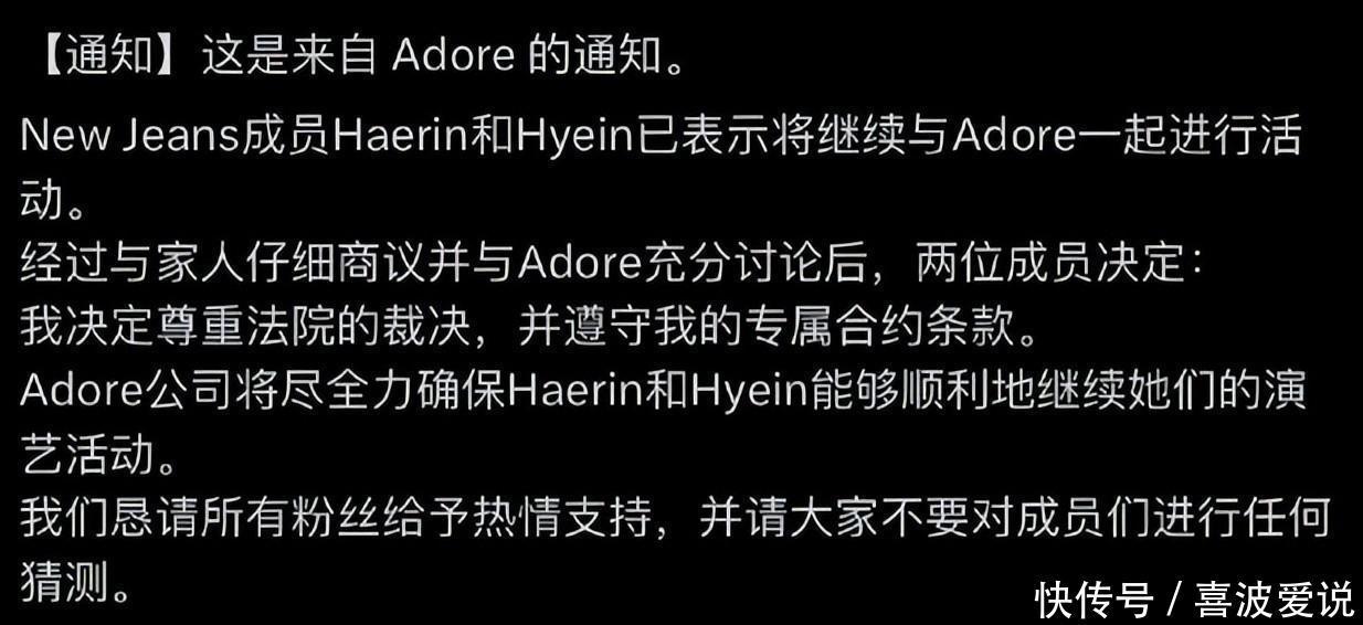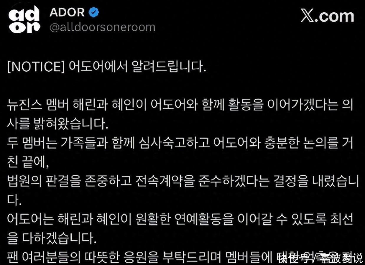 ADOR 11 月 12 号发了声明,NewJeans 的姜谐潾和李惠仁要接着履行合约,跟公司继续合作。俩人跟家人、公司聊透了,决定听法院的,按合约来。另外三位看着还想跟着闵熙珍,这事儿跟 FIFTY FIFTY 也太像了,说实话,这两位回头真挺明智的。 肯定有粉丝骂她们 “叛变”,但换个思路,天价违约金不用愁了呀!那笔钱哪是艺人能扛的?闵熙珍现在都躲着不露面,估计有人慢慢醒过神 —— 犯不着为了别人毁自己前途。说不定成员自己没想通,但家里长辈拎得清,才劝着回头的。